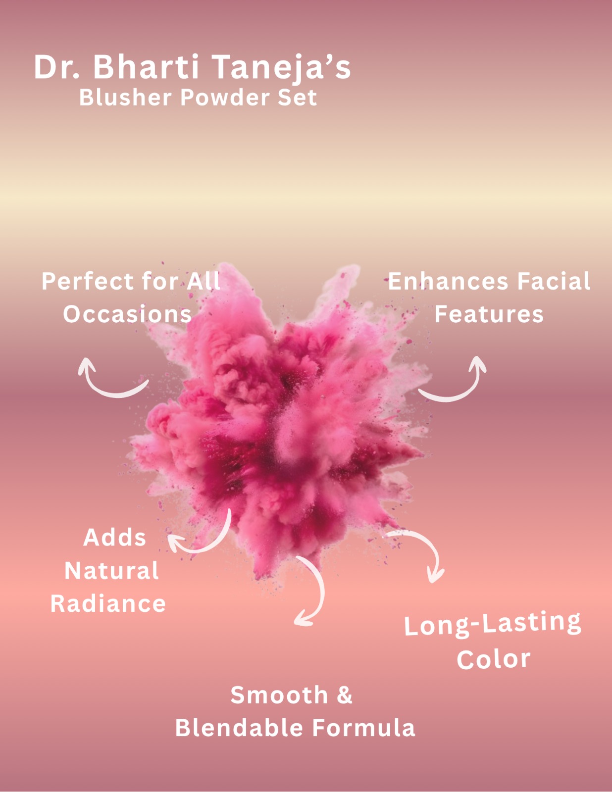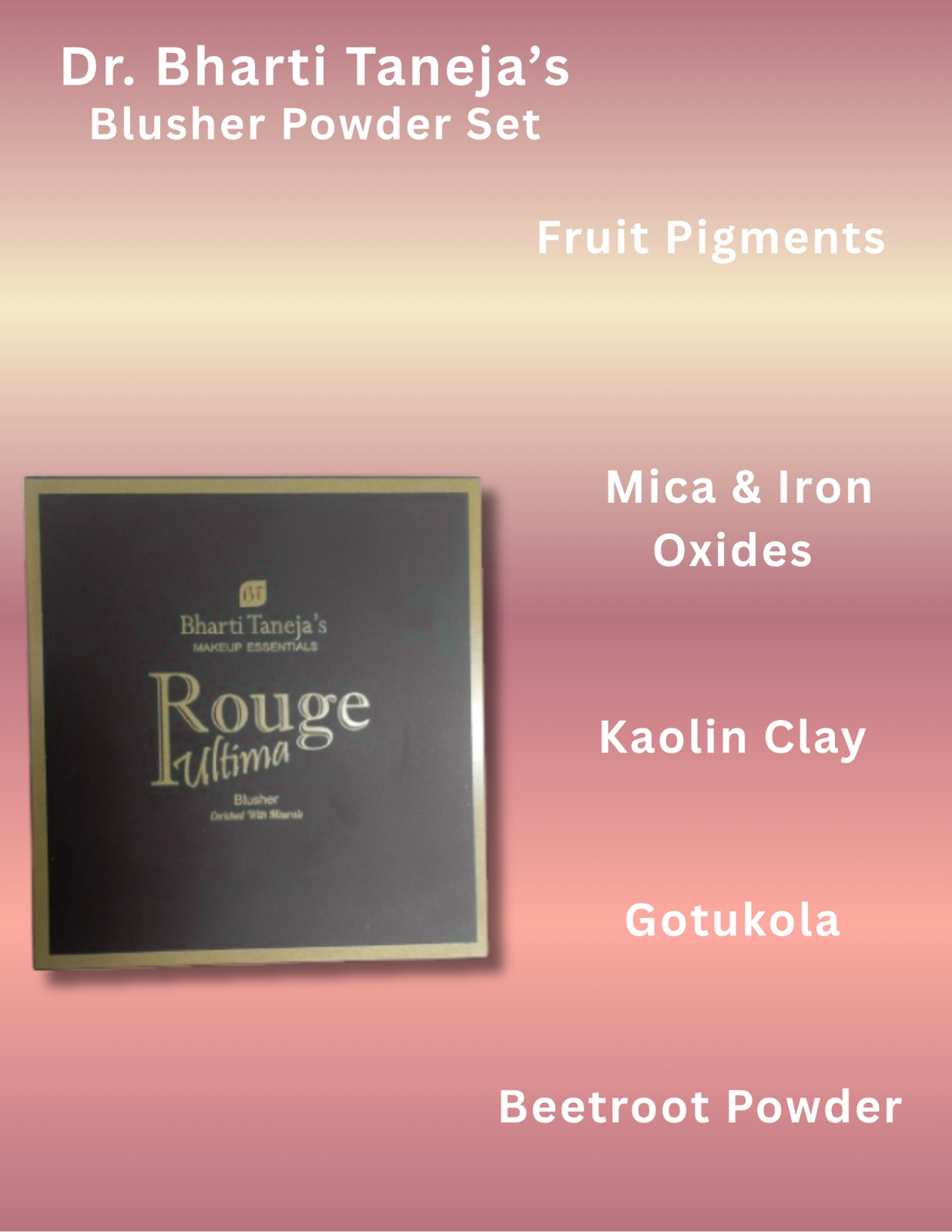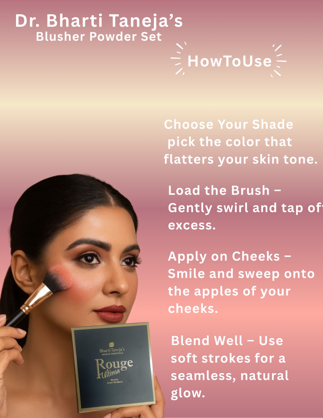 Enhance your natural glow with Dr. Bharti Taneja’s Blusher Powder kit , specially designed to add a pop of color and youthful radiance to your cheeks. This smooth, finely milled powder blends effortlessly, giving your skin a soft, natural flush that lasts all day.