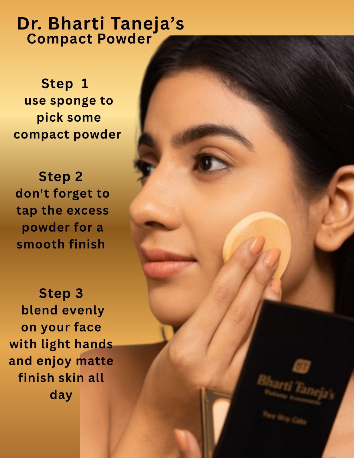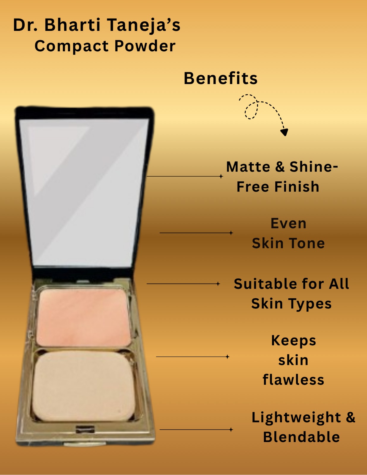 Achieve a smooth, even-toned, and shine-free complexion with Dr. Bharti Taneja’s Compact Powder. This lightweight, blendable powder offers long-lasting coverage, minimizing the appearance of pores and imperfections while keeping your skin fresh and matte throughout the day.