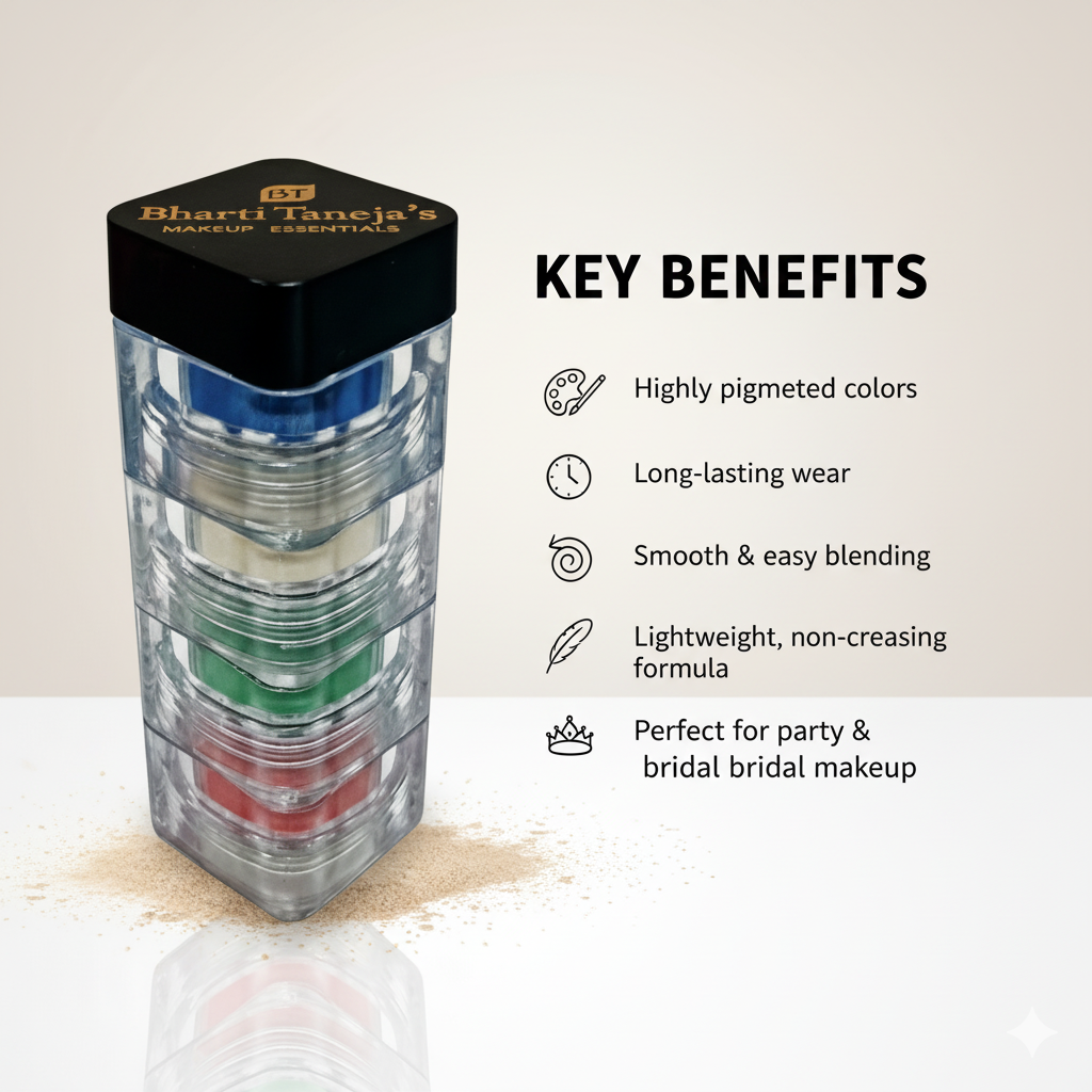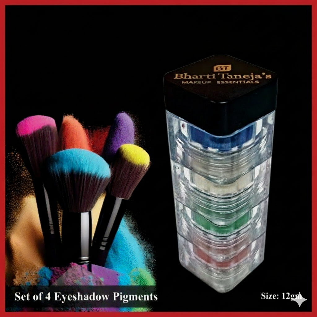 Elevate your eye makeup game with Dr. Bharti Taneja’s Set of 4 Eyeshadow Pigments. This versatile palette features four highly-pigmented shades that blend seamlessly for creating bold, dramatic, or natural looks. Perfect for both daytime elegance and glamorous evening styles, these eyeshadows offer smooth, crease-resistant application and long-lasting wear.