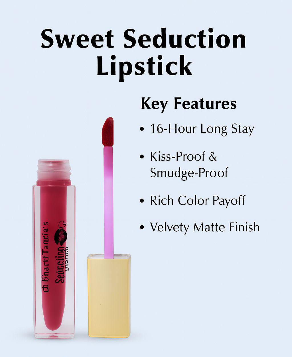 Indulge in irresistible glamour with Bharti Taneja’s Sweet Seduction Lipstick – where bold beauty meets nourishing care. Designed for the modern, confident woman, this richly pigmented lipstick delivers vibrant color payoff in just one swipe. Whether you’re stepping out for a casual day or dressing up for a glamorous night, Sweet Seduction ensures your lips look flawless, seductive, and selfie-ready all day long.